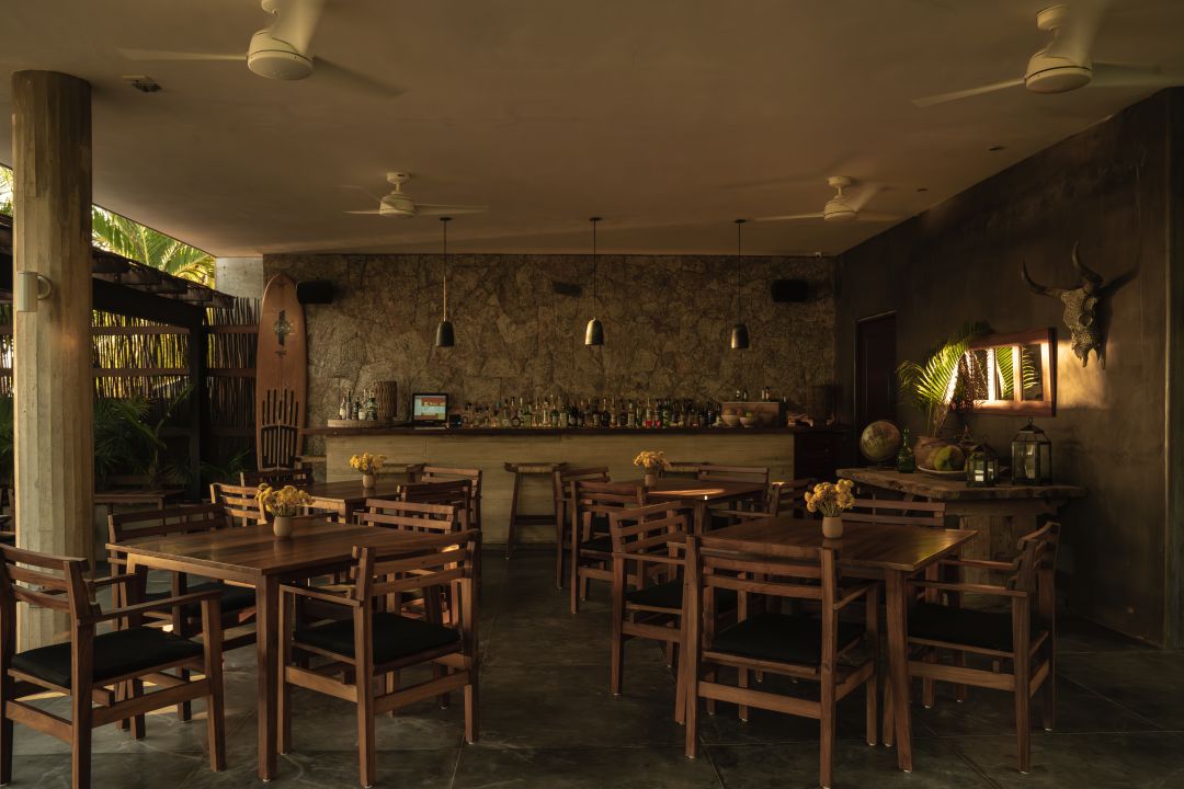 Just steps from the shore, La Terraza unfolds beneath a handcrafted wooden pergola, where the Pacific breeze and the rhythm of the waves shape each moment. Colors echo the surrounding landscape—the mint blue of the chairs against rustic concrete floors, tropical wood tables reflecting the warmth of the coast—creating a sanctuary of refined simplicity.